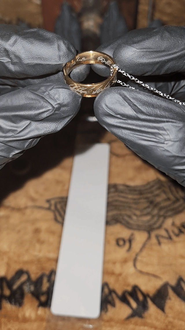 Yüzük üzerindeki yazı ve motifler, ışıkla temas ettiğinde daha net görünmesi için özel olarak işlenmiştir. Bu detaylar ürüne derinlik katar ve GIF üzerinde dahi fark edilebilen güçlü bir görsel etki oluşturur.